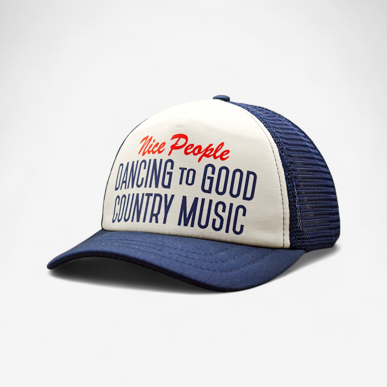 Straight off a dancehall marquee, the “Nice People Dancing to Good Country Music” hat nods to nights when the lights were glowing, the band was twangin’, and the dance floor stayed full ’til closing time. This foam trucker is a tribute to the simple truth: the best nights are always made of good country music and good people.